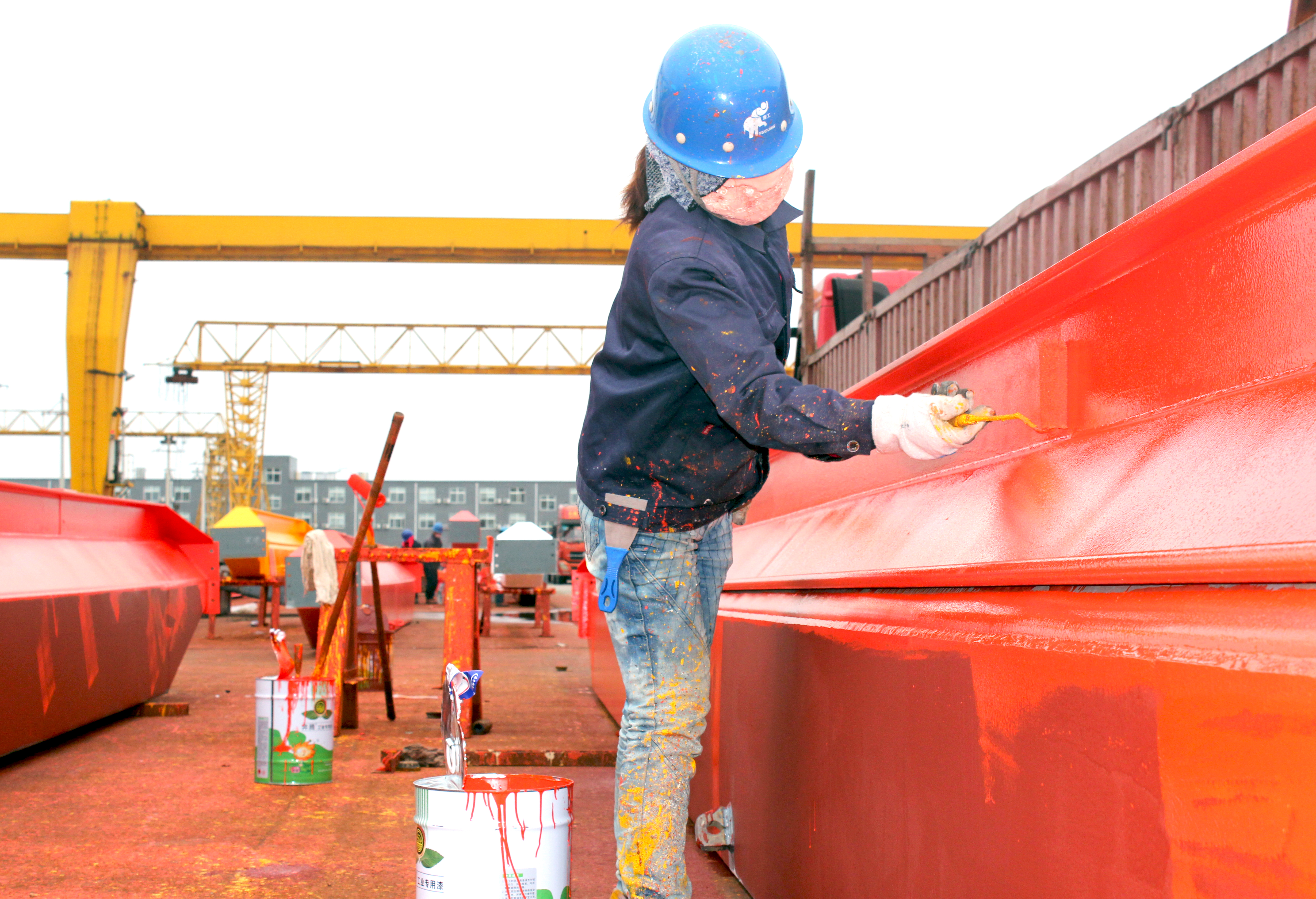 單梁油漆場(chǎng)地在公司的西北角,在油漆場(chǎng)地工作的董秀娥師傅是公司諸多普普通通室外工作者中的一員,看到雨水困住,她今天一大早就來到刷漆班開始了她一天的工 作。頭上戴著藍(lán)色安全帽,身上穿著藍(lán)色的工裝,手上戴著一雙浸有黃色油漆的白色手套,腳上穿著酒紅色的防砸鞋,一大塊布把自己的臉包的嚴(yán)嚴(yán)實(shí)實(shí),只留著一雙雙眼皮的大眼睛在外面。準(zhǔn)備工作做完以后,她一只手提著油漆桶,一只手拿著刷子,來到一臺(tái)起重機(jī)的主梁前便開始了工作。